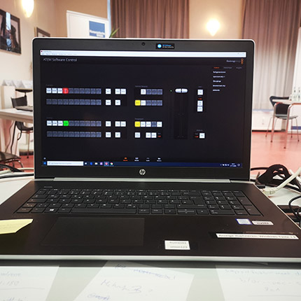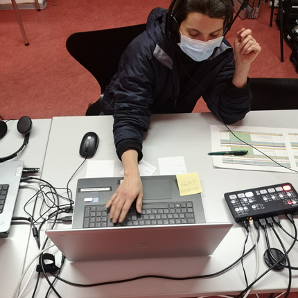 „Ich war vor Ort für die Mikrofone und Kameras zuständig. Es hat viel Spaß gemacht und eine völlig neue Erfahrung, dass einige Referenten aber nicht die Teilnehmenden bei uns vor Ort sind. Womit ich nicht gerechnet hatte, dass gleich zu Beginn die Standkamera für das Podium ausgefallen ist und ich mit nur einer Kamera die Veranstaltung einfangen muss.“ (Angela)