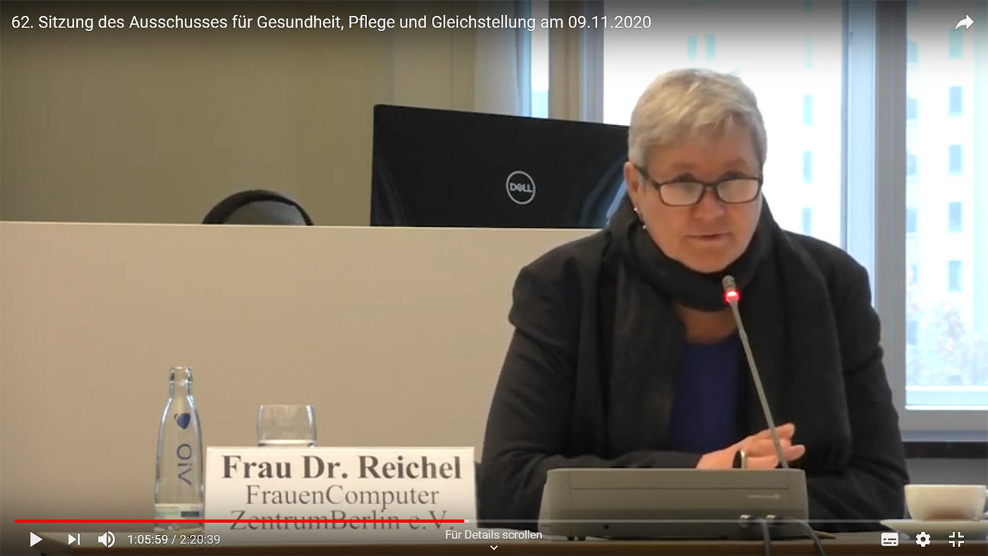 Am 9. November hat FCZB-Geschäftsführerin Karin Reichel im Abgeordnetenhaus vor dem Ausschuss für Gesundheit, Pflege und Gleichstellung gesprochen. Dabei ging es um das Thema „„Digitalisierung geschlechtergerecht weiterdenken und gestalten“. Im Video könnt ihr ihre Statements noch einmal nachhören (Start bei 1:04:00, Dauer ca. 9 Minuten) Link zum Video
